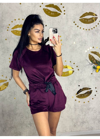 Костюм изготовлен из мраморного велюра, который имеет гладкую фактуру. Ткань имеет большую растяжимость, учитывайте это при подборе размера. Благодаря своему фасону хорошо садится по фигуре. Футболка с короткими цельнокроеными рукавами и круглым вырезом горловины. Благодаря отсутствию вертикального плечевого шва создается свободный силуэт. Шорты с высокой посадкой и резинкой на талии без застежек. Обратите внимание, что у шорт нет карманов.