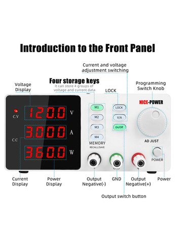 1. Трехрядный 4-разрядный цветной ЖК-дисплей, работающий в режиме реального времени, интуитивно понятный и четкий. 2. 4 комплекта хранения данных для удобного рабочего вызова. 3. Функция блокировки панели для предотвращения неправильной работы. 4. Управление значениями тока и напряжения с помощью энкодера. 5. Функция переключения выхода, которая может предварительно установить напряжение и ток. 6. Интеллектуальный вентилятор с датчиком температуры, эффективно продлит срок службы вентилятора и уменьшает шум. 7. Разработано по технологии SMPS (супер миниатюрные источники питания) 8. Несколько функций защиты: защита от перенапряжения (OVP), защита от перегрузки по току (OCP), защита от перегрева (OTP), защита от перенапряжения (OPP), защита от короткого замыкания. Области применения 1. Тестирование производственной линии. 2. Ремонт мобильных телефонов, компьютеров и электротехники. 3. Старение изделия, гальваническое покрытие. 4. Зарядите аккумулятор. 5. Лаборатории, исследования и обучение. 6. Для всего остального оборудования требуется регулируемый постоянный ток. спецификация: Модель: SPPS3010D цвет: Белый Выходное напряжение: 0-30В Выходной ток: 0-10А Разрешение по напряжению: 0,01 В Разрешение тока: 0,001A Напряжение пульсации: Vpp≤1% Силовое воздействие: CV≤1%+10mV Эффект нагрузки: CV≤1%+10mV Цифровой дисплей: 4 светодиодных цифровых дисплея Шум пульсации: ≤1MV Точность отражения напряжения: ±1% + 1 цифра Текущая точность отображения: ±1% + 2 цифры Вес: 1,6кг Размер: 95*220*140 мм