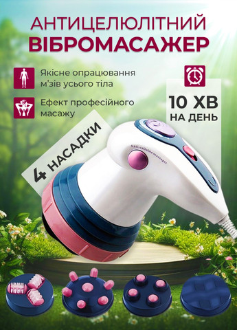 Антицеллюлитный массажер Body massage 4 насадки Вибромассажер Body massage поможет вам создать красивую фигуру и стройные ноги. Массаж у Вас дома с эффектом лифтинга, который поможет Вам, избавится от целлюлита и так называемой «апельсиновой корки». Функциональность массажера – инфракрасное излучение. Используя его всего 10 минут в день, Вы избавляетесь от лишних жировых складок на теле, целлюлита, а также боли в спине, шее, ногах и руках. Особенности: тройное действие: круговой массаж, пневматическое давление, инфракрасное тепло; моделирует фигуру и разглаживает «апельсиновую корочку»; улучшает кровообращение и обмен веществ; специальные силиконовые ролики для массажа головы; возможность самому выбирать интенсивность массажа; увеличивает приток крови, что способствует выведению токсинов и снижению веса; нормализует цвет кожи и придает ей свежесть; Характеристики: 4 сменные массажные головки + IR Инфракрасный прогрев Плавная регулировка вибрации/интенсивности массажа Интенсивный вибрационный массаж Переключатель ВКЛ/ВЫКЛ. Питание: 230В Мощность: 28W Комплектация: Массажер 4 насадки Коробка