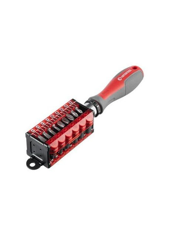 Отвертка с комплектом насадок изготовлена по последним технологиям и соответствует высоким запросам мастеров. Предназначена для монтажа и демонтажа резьбовых соединений с различным типом шлицов. Такая реверсивная отвертка станет отличным помощником в домашнем арсенале инструмента, а также в собственной мастерской, на производстве. Высокое качество стали Насадки и отвертка изготовлены из прочной Cr-V стали, которая известна всем мастерам своей надежностью и выносливостью. В составе этой стали присутствуют хром и ванадий, которые придают изделию высокую стойкость к износу. Также сталь отличается долговечностью и не подвержена хрупкому разрушению. Все инструменты в наборе покрыты антикоррозионным слоем. Отвертка с магнитом и храповым механизмом Внутри отвертки установлен магнит для надежного удержания насадок. Храповый механизм позволяет работать в ограниченном пространстве и в труднодоступных местах, где нет места для маневров. Удобная рукоятка Форма ручки обеспечивает максимальную эффективность от приложенного усилия, а наличие реверса делает работу более комфортной. Двухкомпонентная рукоятка гарантирует отличное сцепление даже с влажными или скользкими руками, благодаря резиновым вставкам. Биты размещены в держателях и не выпадают. Вы быстро найдете необходимую насадку, благодаря нанесенной маркировке под каждой ячейкой. Комплектация: Отвертка реверсивная 1/4"; биты: SL3x2, SL4x2, SL5x3, SL6x3, PH0x2, PH1x2, PH2x3, PH3x3,PZ0x2, PZ1x2, PZ2x2, PZ3x2 T10, T10x2, T15x2, T20x2, T25x2, T27x2, T30x2, H3x2, H4x2, H5x2, H6x2, S0x2, S1x2, S2x2, S3x2. Количество единиц в наборе: 57 ед.; Материал рукоятки: прорезиненная, двухкомпонентная; Магнит: есть
