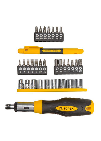 Отвертка реверсивная Topex (PH, PZ, SL, Torx, HEX) с насадками 34 шт Наконечники отверточные TOPEX изготовлены из высококачественной хромванадиевой стали, что обеспечивает продленный срок эксплуатации инструментов. Эргономичная ручка, покрытая противоскользящим материалом, обеспечивает высокий комфорт эксплуатации. Механизм трещотки, встроенный в рукоятку, позволяет сэкономить время во время работы. Кроме того, в комплекте находится рукоятка в форме ручки с наконечниками – удобное и практичное решение. Марка TOPEX адресована мастерам, занимающимся мелким ремонтом. Комплектация: торцевые головки - 9 шт.;переходник - 1 шт.;рукоятки - 2 шт.;наконечники- 22 шт.
