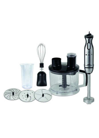 Блендер ручной – универсальный прибор 4 в 1 для измельчения и сбивания, имеющий мощный, но тихий двигатель мощностью 800 Вт. Работает в двух режимах, что позволит выбрать нужную скорость в соответствии с Вашими предпочтениями и типом блюд, которые вы хотите приготовить. Специально разработанная конструкция корпуса в форме купола обеспечивает комфорт во время приготовления, а 4 лезвия гарантирует отличное и безупречное смешивание. Насадка-блендер предназначена для быстрого и эффективного взбивания кремов, муссов, десертов и т.д. Она обеспечивает оптимальный поток ингредиентов для смешивания и лучшее увлечение. Дополнительный комфорт использования дает мягкая, нескользящая ручка, которая поможет надежно удерживать устройство даже в мокрых руках. Мерный стакан на 600 мл. в комплекте для смешивания ингредиентов. Измельчить пряные травы, чеснок, орехи, сыр пармезан с помощью насадки измельчителя легко и быстро. Взбитые сливки для торта, воздушное безе из яичных белков, омлет и легкое тесто для тонких блинчиков поможет приготовить венчик насадка. Насадки легко отсоединяются и моются. Все детали кроме рабочего блока с мотором можно мыть в посудомоечной машине. Характеристики: ● Тип: погружной ● Мощность: 800 Вт ● Питание: сеть 220 В ● Емкость чаши для измельчения: 600 мл ● Емкость чаши блендера: 500 мл ● Количество скоростей: 2 ● Количество ножей: 4 ● Скорость вращения: 10000-14500 об/мин ● Материал насадки для блендера: нержавеющая сталь. ● Материал насадки для взбивания: нержавеющая сталь. ● Материал чаши и стакана: Пластик ● Длина шнура: 1 м