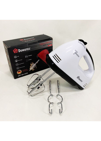 Миксер с чашей Domotec MS 1366 - очень удобный, легкий в использовании и очистке. Корпус миксера подставка и чаша изготовлены из пластика, а насадки из нержавеющей стали, продуманная до мелочей эргономика придает дополнительный комфорт в использовании данного миксера. MS 1366 имеет 7 скоростных режимов работы для взбивания продуктов различной плотности, его мощность позволяет легко взбивать яйца, соусы или бисквитное тесто. В комплекте Domotec MS-1366 имеется большая чаша, на которую легко устанавливается миксер, тем самым превращая его в стационарный прибор, что позволяет освободить руки на кухне. Также имеются два венчика для взбивания и дополнительные крюки для замешивания теста, что по достоинству оценят хозяйки, которые любят радовать свою семью различной выпечкой. Особенности и преимущества: Миксер можно использовать в ручном режиме и на стационарной подставке. 7 скоростей работы позволяют выбирать максимально эффективный для поставленной задачи режим. Корпус миксера изготовлен из пластика, а насадки из нержавеющей стали. Технические характеристики: 7 скоростей Питание: 220V 50Hz Материал корпуса: пластик Объем чаши: 2л Наклон подставки на 45 градусов Кнопка для удобной экстракции насадок Комплектация: Миксер 2 шт насадка для взбивания 2 шт насадка для теста Подставка Чаша Инструкция Заводская упаковка