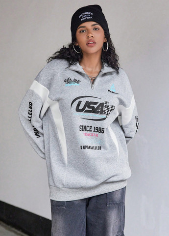 Толстовка – универсальная уличная одежда. Эта толстовка имеет цветной принт с буквами и воронкообразный вырез. Имеет свободный крой и стандартный подол. Ткань не тянется. Имеет застежку-молнию и рукава с приспущенным плечом.