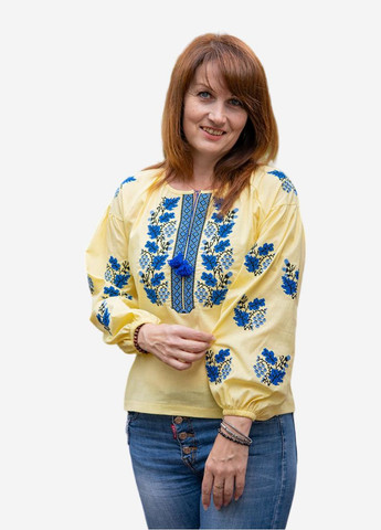 Стильная блуза из коллекции «Я – Украина» придаст яркий акцент в вашем стиле, она гарантированно не оставит вас незамеченной. Вышиванка окутает нежностью льняных и тележных волокон, погрузит вас в приятные воспоминания, где все вокруг родное, дорогое сердцу. Рубашка выполнена прямым силуэтом, имеет застежку на пилочке в виде пуговиц. Рукава прямые, длинные, горловина с отложным воротником. Символизм вышитых узоров на изделии рассказывает о ценности всего, что мы имеем: изображение пары в центре композиции – это отражение крепких, фундаментальных отношений семьи, непреодолимых и многогранных; вышитое полотенце – символ неизменных традиций и благословения; калина – непрерывная связь между поколениями; аисты – символы счастья и удачи; подсолнухи олицетворяют Родину. «Снова солнце ласковое луч свой посылает и степям, и долинам, и потокам горным. Это моя Украина день новый встречает – моя кроткая мать улыбается всем» – вышивка, пронизывающая сердце теплом и вдохновляющая. Такую рубашку гарантированно не захочется снимать!