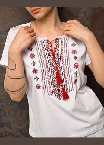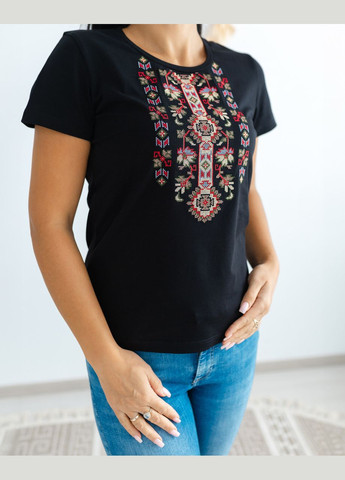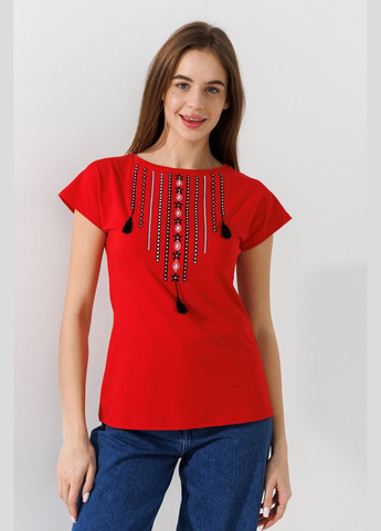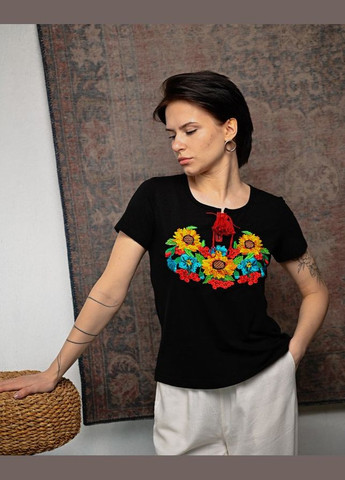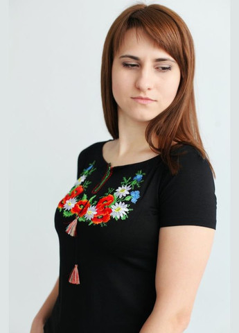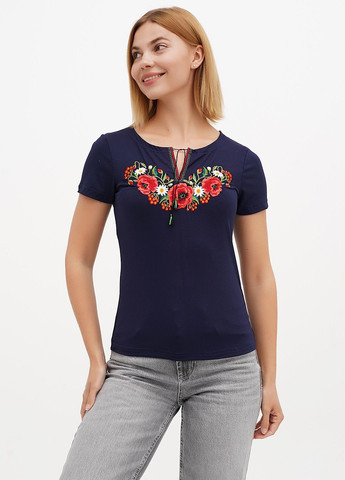 Женская вышиванка Lesia Маковый цвет на темно-синей ткани с коротким невышитым рукавом Эта вышиванка является продолжением линейки "Маковый цвет", которая отличается яркой цветочной композицией, состоящей из трех крупных красных маков и маленьких ромашек, ягод рябины и зеленых листьев. Мягкая, приятная на ощупь ткань состоит из вискозы и эластана. Она хорошо держит форму и не мнется, является воздухопроницаемой, поэтому не парит. Фасон позволяет комбинировать наряды как с классическими, так и с кэжуал элементами, создавая нежный женственный лук.