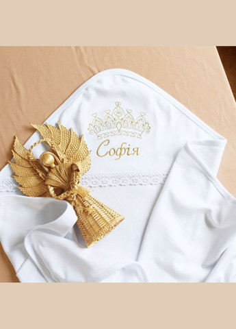 Именная крестца для крещения девочки Диадема_x000D_ Именная крестца для крещения ребенка с вышивкой Диадема в белом цвете от ТМ Ladan. Красивая вышивка на углу очень подойдут маленькой девочке - маминой и папиной принцессе. Узор выложен из многих сердечек, особенного шарма добавляет золотая люрексная нитью. На углу есть возможность вышить любое имя ребенка. Также можно изменить цвета вышивки и центральный рисунок. Контур крестца обшит бейкой, край угла отделан белым кружевом (может отличаться от того, что на фото). Низ вышивки проклеен специальной защитной тканью. Размер 90 см*80 см. Трикотажная хлопчатобумажная ткань интерлок.