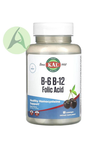 * Качество, которому доверяют с 1932 года| * Прием 1 раз в день| * Поддержка здорового гомоцистеина| * Натуральный ароматизатор| * Не содержит глютена| * Пищевая добавка| Описание. Витамины B6, B12 и фолиевая кислота действуют синергетически, обеспечивая питательную поддержку нормальной и здоровой функции сердечно-сосудистой системы, способствуя синтезу красных кровяных телец, поддерживая здоровый метаболизм белков и поддерживая нормальный уровень гомоцистеина.| | РЕКОМЕНДАЦИИ ПО ПРИМЕНЕНИЮ| Растворяйте по 1 пастилке в день. Применять только согласно инструкции.| | ИНГРЕДИЕНТЫ| Сорбитол, фруктоза, пищевые жирные кислоты, натуральная черная вишня с другими натуральными ароматизаторами, стеариновая кислота, диоксид кремния и лимонная кислота.| | ПРЕДУПРЕЖДЕНИЯ| Перед началом применения следует проконсультироваться с врачом. Хранить в сухом и прохладном месте. Хранить в недоступном для детей месте.| | Пищевая ценность| Размер порции: 1 пастилка| Количество в 1 порции % от суточной нормы| Калории 5| Всего углеводов < 1 г < 1%†| Сахар 1 г *| Витамин B6 (в виде пиридоксина гидрохлорида) 50 мг 2941%| фолат (400 мкг фолиевой кислоты) 680 мкг DFE 170%| Витамин B12 (в виде цианокобаламина) 380 мкг 15 833%| † Процент от суточной нормы при условии потребления 2000 калорий в день. * Суточная норма не определена.