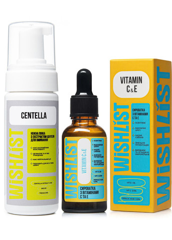 Комплект средств, которые идеально дополнят твою ежедневную рутину по уходу за лицом. Пенка и сыворотка идеально дополняют друг друга и дарят бережную очистку, питание и восстановление. Средства с различной концентрацией экстракта азиатской центеллы, пролонгирующие и усиливающие действие друг друга, это находка для здоровой, восстановленной кожи. Состав набора: - Нежная пенка с экстрактом центели для умывания WiSHLiST CLEANSING FOAM, 150 -сыворотка с витаминами С и Е WiSHLiST VITAMIN C&E, 30 мл Активные компоненты пенки и их воздействие на кожу: Centella Extract 2.5% успокаивает и укрепляет, помогает снять воспаление, укрепить сосуды и успокоить кожу после стресса. – Благодаря мягким поверхностно-активным веществам, пенка обеспечивает нежную очистку без раздражений, поддерживая естественный баланс кожи. – Inulin и Trehalose помогают восстановить микрофлору, способствуют укреплению защитного барьера кожи и поддерживают ее естественную микрофлору. – Подходит для всех типов кожи: формула с нейтральным pH предназначена для ежедневного использования даже на чувствительной коже. Активные компоненты сыворотки и их воздействие на кожу: – Стабилизированный витамин C в концентрации 0,5% эффективно борется с пигментацией, стимулирует синтез коллагена и делает кожу сияющей и ровной. – Витамин E в концентрации 1% увлажняет, защищает от повреждений свободными радикалами и укрепляет барьерные функции кожи, а феруловая кислота усиливает действие витаминов C и E, предотвращая фотостарение. – Феруловая кислота – 0.5% усиливает действие витаминов C и E, предотвращает фотостарение и обеспечивает длительную защиту кожи. – Сыворотка улучшает структуру кожи, придает ей здоровый вид и предотвращает признаки старения. Способ использования: 1. Нанести небольшое количество пенки на влажную кожу, массировать лицо легкими движениями и смыть теплой водой. Использовать утром и вечером. 2. Сыворотку нанести на очищенную кожу тонким слоем, подождать до полного поглощения 10-15 минут и при необходимости нанести крем. Для оптимальных результатов используйте каждый день. Предостережение Натуральная косметика не гипоаллергенна. За 24 часа до применения проведите аллергопробу на сгибе локтя.