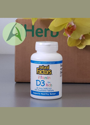 Natural Factors, витамин D3, со вкусом клубники, 10 мкг (400 МЕ), 100 жевательных таблеток Срок годности: 04.2025 Описание Диетическая добавка Способствует поддержанию здоровья костей Подходит для вегетарианцев Чистота и эффективность гарантированы Витамин D3 увеличивает усвоение организмом кальция с едой. Благодаря регулированию уровня кальция, он также помогает контролировать работу иммунной системы и поддерживать здоровье нервов и мышц. Жевательные таблетки со вкусом клубники, подслащенные ксилитом (низкокалорийным подсластителем с низким гликемическим индексом). Сертификат Isura Без ГМО: документально подтверждено ✔ Масс-спектрометрия: продукт прошел лабораторные испытания ✔ Рекомендации по применению Детям от 3 лет: разжевывать по 1 таблетке 1–2 раза в день или в соответствии с рекомендациями врача. Другие ингредиенты Ксилит, натуральный ароматизатор «Клубника», стеарат магния (растительного происхождения), краситель (красная морковь). Не содержит искусственных консервантов, подсластителей, молочных продуктов, пшеницы, глютена, дрожжей, сои, яиц, рыбы, моллюсков, соли, древесных орехов, ГМО. Изготовлено компанией Natural Factors с гарантией безопасности и эффективности в соответствии со стандартами надлежащей производственной практики (GMP), разработанными Управлением по санитарному надзору за качеством пищевых продуктов и препаратов (FDA) США и Министерством здравоохранения Канады. Предупреждение Перед применением диетических добавок во время беременности, планирования беременности, грудного вскармливания, приема препаратов, подготовки к хирургической операции или при наличии заболеваний следует проконсультироваться с врачом. Хранить в месте, недоступном для детей. Питательная ценность Размер порции: 1 жевательная таблетка Количество в 1 порции % от суточной нормы Витамин D3 (холекальциферол) 400 МЕ 100 %