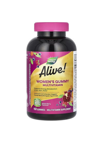 Свойства продукта: Поддерживает высокий уровень энергии и жизненного тонуса Способствует повышению концентрации внимания Поддерживает память Поддерживает иммунную систему Способствует нормализации гормонального фона Показания к применению Женщинам принимать 2 жевательные мармеладки в день. Что это? Комплекс Alive! Women's от американского бренда Nature's Way — это лучший витаминно-минеральный комплекс для женщин. Главное преимущество этого препарата в том, что все необходимые полезные вещества, витамины, минералы женщина может получить благодаря одной жевательной таблетки в день, с приятным вкусом ягод. Данный комплекс подойдет как для профилактической поддержки организма, так и для улучшения самочувствия. Благодаря богатому составу, положительно влияет на все функции и системы организма. Как это работает? Немаловажной функцией комплекса является замедление процессов старения. Этот эффект достигается за счет тщательно продуманного и сбалансированного состава. Витамины группы В, в том числе биотин и фолиевая кислота, нужны для укрепления и оздоровления волос, кожи и ногтей. Комплекс минералов нужен для крепких костей и гибких суставов. Еще одним интересным компонентом этого комплекса является специальная смесь для женского здоровья, которая включает полезные экстракты органических фруктов и овощей. Элемент Вес Единица Процент Порция 2 жевательные конфеты Порций в упаковке 75 Калории 20 Всего углеводов 5 г 2%† Всего сахара 4 г ** Содержит 4 г добавленного сахара 8%† Витамин A (в виде ретинилпальмитата) 450 мкг 50% Витамин C (аскорбиновая кислота) 30 мг 33% Витамин D3 (в виде холекальциферола) 40 мкг 200% Витамин E (в виде dl-альфа токоферилацетата) 15 мг 100% Тиамин (в виде тиамина гидрохлорида) 0,3 мг 25% Рибофлавин 0,325 мг 25% Ниацин (в виде никотинамида) 4 мг 25% Витамин B6 (в виде пиридоксина гидрохлорида) 2,6 мг 153% Фолат 400 (240) мкг пищевого фолатного эквивалента (мкг фолиевой кислоты) 100% Витамин В12 (в виде цианокобаламина) 3,6 мкг 150% Биотин 37,5 мкг 125% Пантотеновая кислота (в виде d-пантотената кальция) 1,3 мг 26% Кальций (в виде трикальцийфосфата) 100 мг 8% Фосфор (в виде трикальцийфосфата) 50 мг 4% Йод (в виде йодида калия) 150 мкг 100% Цинк (в виде цитрата цинка) 1,9 мг 17% Натрий 20 мг 1% Порошковые смеси Orchard Fruits™ и Garden Veggies™: Апельсин, голубика, морковь, слива, гранат, клубника, груша, яблоко, свекла, малина, ананас, тыква, вишня, цветная капуста, виноград, банан, капуста, томат, ягоды асаи, спаржа, брюссельская капуста, клюква, огурец, горох, брокколи, шпинат 75 мг ** Бор (в виде бората натрия) 150 мкг ** Инозитол 40 мкг ** † Процент от суточной нормы при условии потребления 2000 калорий в день. ** Суточная норма не определена