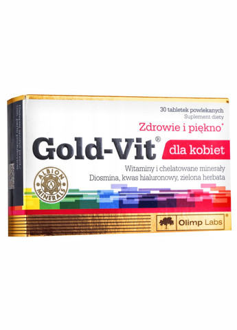 Gold-Vit for women представляет собой композицию витаминов и минералов, преимущественно в виде легкоусвояемых хелатов аминокислот Альбион®, которая помогает покрыть основные потребности женского организма в незаменимых микроэлементах. Формула дополнена изофлавонами сои, экстрактом зеленого чая, гиалуроновой кислотой и диосмином, а также экстрактом черного перца Bioperine®. В препарате используются хелатные минералы производства лидера рынка фармацевтического сырья – американской компании Альбион®, которые полностью безопасны в применении, не раздражают желудок и не препятствуют всасыванию других минералов. Магний, как и витамин В6, способствует снижению утомляемости и усталости организма, повышает его жизненный тонус. Цинк, медь, селен и витамин С, способствует правильному функционированию иммунной системы. Витамины группы В играют важную роль в энергетическом обмене, работе нервной и кроветворной систем (витамин В6, В12, фолиевая кислота), процессах зрения (витамин В2), снижении чувства усталости (витамин В2, пантотеновая кислота, витамин В6, фолиевая кислота). Биотин, как витамин А и цинк, помогает поддерживать здоровье кожи. Экстракт зеленого чая усиливает жировой обмен, что способствует поддержанию красивой фигуры, благотворно влияет на работу системы кровообращения и уровень сахара в крови, а также помогает защитить организм от окислительного повреждения клеток, замедляя процесс их старения. Экстракт черного перца поддерживает пищеварение и усвоение питательных веществ, поэтому может повысить эффективность других растительных ингредиентов. Кроме того, он обладает антиоксидантными свойствами и поддерживает иммунную систему. Гиалуроновая кислота — структурный и функциональный компонент соединительной ткани, природный биополимер, вещество, строящее внеклеточный матрикс дермы, обладающее водосвязывающими свойствами. Состав одной порции - 1 таблетка: Витамин А (RE) - 800 мкг (100%*) Витамин D - 10 мкг (200%*) Витамин Е (α-ТЕ) - 12 мг (100%*) Витамин С - 80 мг (100%*) Витамин B1 - 1,1 мг (100%*) Витамин B2 - 1,4 мг (100%*) Ниацин (NE) - 16 мг (100%*) Витамин B6 - 1,4 мг (100%*) Фолиевая кислота - 200 мкг (100%*) Витамин B12 - 2,5 мкг (100%*) Биотин - 100 мкг (200%*) Пантотеновая кислота - 6 мг (100%*) Диосмин -100 мг Экстракт зеленого чая (55% EGCG) - 40 мг из них: в том числе: эпигаллокатехин-3-галлат (EGCG) - 22 мг Экстракт изофлавонов сои (40%) - 10 мг в том числе изофлавоны сои - 4 мг Гиалуроновая кислота - 2 мг Экстракт черного перца Bioperine® - 1 мг Кальций - 120 мг (15%*) Магний - 56,3 мг (15%*) Цинк - 10 мг (100%*) Железо - 3,5 мг (25%*) Марганец - 1 мг (50%*) Медь - 250 мкг (25%*) Йод - 150 мкг (100%*) Хром - 50 мкг (120%*) Селен - 55 мкг (100%*) * - % от рекомендованой суточной нормы Ингредиенты: карбонат кальция, витамины (L-аскорбиновая кислота - витамин С, DL-альфа-токоферилацетат - витамин Е, никотинамид - ниацин, D-биотин - биотин, ретинилацетат - витамин А, D-пантотенат кальция - пантотеновая кислота, пиридоксин. гидрохлорид – витамин В6, холекальциферол – витамин D, птероилмоноглутаминовая кислота – фолат, тиамина мононитрат – витамин В1, рибофлавин – витамин В2, цианокобаламин – витамин В12), наполнитель – микрокристаллическая целлюлоза, диосмин, наполнители – изомальт, натрий сшитый. карбоксиметилцеллюлоза; антислеживатель - оксид магния, бисглицинат кальция, бисглицинат магния, бисглицинат цинка, экстракт зеленого чая (Camellia sinensis L.), глазирующие вещества - поливиниловый с