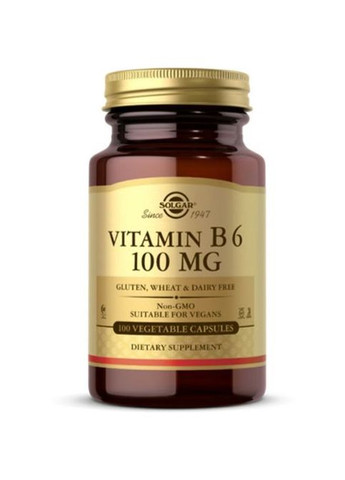 Витамин В6 (пиридоксин) - необходим для синтеза белков, сахаров, ферментов, гемоглобина, эритроцитов. Он участвует в образовании антител, серотонита и норадреналина, необходимых для функции нервной системы (образование миелина), участвует в усвоении нервными клетками глюкозы. Cостав: Компонент Состав 1 порции (1 капсула) Витамин B6 (как пиридоксин HCl) 100 мг Другие ингредиенты: Овощная целлюлоза, растительный стеарат магния, растительная стеариновая кислота, микрокристаллическая целлюлоза, диоксид кремния. Не содержит: Без глютена, пшеницы, молочных продуктов, сои, дрожжей, сахара, натрия, искусственного вкуса, подсластителя, консервантов и цвета. Функциональное действие: Витамин В6 принимает участие в важных биохимических процессах в белковом и жировом обмене, усвоение ненасыщенных жирных кислот, нормализации холестеринового обмена. Пиридоксин принимает участие в процессе кроветворения: синтезе эритроцитов, гемоглобина, что предотвращает развитие анемий. Также пиридоксин поддерживает работу сердечно-сосудистой системы, предотвращает образование тромбов, развития атеросклероза, инфаркта, инсульта, нормализует давление. Витамин В6 укрепляет иммунитет, увеличивая выработку антител. Пиридоксин регулирует деятельность нервной системы, повышает работоспособность мозга, улучшает память (участвует в процессе изготовления серотонина и норадреналина). Дефицит витамина В6 у взрослых может вызвать проблемы со здоровьем, связанные с нервной системой. Витамин В6 регулирует работу печени (обладает липотропным действием). Дефицит витамина В6 можно восполнить, употребляя витаминные комплексы, содержащие этот витамин. Поддерживает женский гормональный баланс. Способствует инактивации избыточных эстрогенов в печени, противодействуя развитию эстрогензависимых опухолей. Применение: В качестве биологически активной добавки взрослым принимать по одной (1) растительной капсуле в день, желательно во время еды или по указанию квалифицированного специалиста. Противопоказания: Индивидуальная непереносимость компонентов. Предупреждение: При беременности, кормлении грудью, приеме каких-либо медицинских препаратов или наличии каких-либо заболеваний следует проконсультироваться с врачом перед употреблением любых пищевых добавок. В случае возникновения каких-либо побочных реакций прекратите использование и проконсультируйтесь с врачом. Хранить в недоступном для детей месте. Не использовать, если внешняя защитная мембрана отсутствует или повреждена.