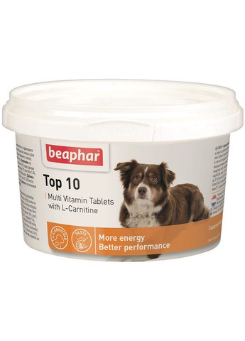 «ТОП 10» для собак – ежедневный универсальный мультивитаминный комплекс с L-карнитином и биотином. Применяется как для взрослых собак, так и для щенков с 6 недель. Витамины, минеральные соли и входящие в его состав микроэлементы - повышают жизненный тонус и сопротивляемость организма, мобилизуя его природные силы, способствуют правильному развитию скелета и зубов у молодых собак, а также значительно улучшают состояние шерсти и придают блеск глазам. Собакам постарше «ТОП 10» помогает сохранить гибкость скелета, придает бодрости и энергичности. L-карнитин, содержащийся в таблетках, укрепляет мускулатуру (в том числе сердечную мышцу) и способствует набору мышечной массы. Молоко и молочные продукты, сахара, минеральные вещества, моллюски и ракообразные (креветки 2,8%), злаки, инактивированные дрожжи, мясо и продукты животного происхождения, масла и жиры. Анализ: протеин 11%, масла и жиры 2,1%, клетчатка 7,4%, зола 13%, влажная 3,4%, кальций 3,4%, фосфор 1,9%, натрий 0,66%, магний 0 ,09%, калия 1,4%. Добавки на 1 кг: витамины А 9560 МЕ, В1 370 мг, В2 770 мг, никотинамид 3000 мг, пантотеновая кислота 2100 мг, В6 350 мг, В12 3200 МЕ, D3 1910 МЕ, Е 650 мг, Е 650 мг 62мг, биотин 80000 мкг, L-карнитин 14 мг, антиоксиданты. Животное должно всегда иметь доступ к свежей питьевой воде. Можно без оговорок давать беременным и лактирующим животным, а также щенкам в возрасте от 6 недель. Не имеет ограничений длительности использования. Противопоказаний нет. Употребление более 4 таблеток на 1 кг веса может спровоцировать диарею, поэтому соблюдайте рекомендованную дозировку.