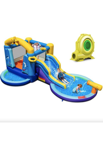 Парк с водными горками Costway Dolphins 7-в-1 с бассейном и водометом Когда фантазии оживают, а вода брызжет во все стороны - появляется пространство, где дети могут быть по-настоящему собой. Именно такой мир создает парк с водными горками Costway Dolphins 7-в-1 с водным бассейном и водометом без воздуходувки, превращающий каждый двор в детскую арену активности. Это не просто горка или батут - это целый комплекс игр, дающий радость, движение и приключения. Летом дети плещутся в бассейне, стреляют из водяной пушки, скользят с горки или играют в кольца. Зимой используют сухой режим: прыгают, соревнуются в мягкой игре и бросают мячи. Изготовлен из прочного материала: Оксфорд 420D с ПВХ-покрытием, этот набор не только красочный, но и выносливый. Сетчатые борта, укрепленные швы, удобная высота перил - все продумано для безопасности. Если вы ищете подарок, который останется в памяти навсегда, этот Аквапарк именно тот! Основные характеристики: Материал: Oxford 420D из ПВХ+сетка Габариты парка: 579×408×250см Батутная зона: 183×146см Бассейн для брызг: 360×259см Зона с мячами: 170×70см Длина горки: 140см Высота сетчатой стенки: 158см. Вход: 55 × 73см Максимальный вес ребенка: 45кг Максимальный общий вес: 91кг Вес изделия: 22,5кг Количество детей одновременно: до 2 Возраст: 3-10 лет В комплекте: 7 колышков для фиксации Ремонтный набор Сумка для хранения Гарантия на такой товар предоставляется на 24 часа после получения! Надувные замки с бассейном - это изделия с непрерывной подачей воздуха. Их работа основана на непрерывном давлении, поддерживаемом насосом. Это не "надул и выключил", а постоянный цикл работы вентилятора, подобно батуту с воздухом. Прочная конструкция Прочная ткань Oxford 420D с ПВХ-покрытием, двойные укрепленные швы и надежные крепления обеспечивают устойчивость к проколам, износу и даже активным ударам. Даже после сезона ежедневного использования цвета остаются яркими, а форма - стабильной. Конструкция оборудована защитными сетками по периметру батута, приподнятыми бортиками (17,8см) у горки, а также имеет мягкий округлый вход размером 55×73см, чтобы избежать травм. Благодаря сертификации ASTM и CPSIA вы можете быть уверены в безопасности малышей. 7-в-1 - максимум игр в одном пространстве Достаточно наполнить бассейн водой, подсоединить шланг к спринклеру - и парк мгновенно превращается в полноценную водную зону. Две горки, просторный бассейн, батут, водяная пушка, яма с мячами, игра с кольцами, боксерский набор - и все это в одном аквапарке. Дети с упоением скользят по скользкой горке прямо в бассейн, стреляют из водяной пушки и играют в брызгах. Такой набор позволяет детям изменять активности каждый час без всякого шанса на скуку. Разнообразие - главный козырь этой конструкции. Сухой режим - идеально для помещения В холодные или дождливые дни надувной парк легко использовать внутри помещения без воды. Батут, кольца, баскетбольная корзина, боксерская груша - все работает в сухом формате. Идеальный вариант для празднования дней рождения или активного досуга на дому. Простая и быстрая установка Парк с водными горками легко разворачивается, надувается через несколько минут (рекомендуемый вентилятор - 680-750 Вт, в комплект не входит) и закрепляется на 7 колышков. Свернуть его так же просто - в комплекте есть сумка для удобного хранения и транспортировки. Надувной Аквапарк 7-в-1 - это лучший подарок, кот