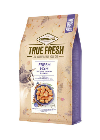 Полнорационный корм класса холистик для взрослых и стерилизованных кошек. Для здоровья кожи и красоты шерсти. Корм производится с использованием свежей рыбы, без зерна и картофеля. Рецептура обогащена ряской, черникой и корнем цикория. 70% состава – свежая рыба, являющаяся продуктом рыбного промысла от местных поставщиков. Уникальный метод производства сохраняет полезные свойства рыбы, отличный вкус, высокую усвояемость и естественную форму питания. Лососевое масло оказывает противовоспалительное действие, способствует улучшению качества шерсти и кожи кота, а также является средством профилактики кожных аллергических реакций. Омега-3 жирные кислоты EPA и DHA из свежей рыбы, лососевое масло и ряска очень полезны для сохранения общего здоровья организма. Они помогают замедлять старение кожи, поддерживают здоровье сердца и обеспечивают нормальное развитие зрения и центральной нервной системы. Клюква, облепиха, черника и ряска являются отличным источником антиоксидантов, защищающих клетки от свободных радикалов. Помогают поддерживать оптимальный рН мочи и здоровое состояние мочевыводящих путей. Состав: свежая рыба (70%), гороховый протеин, красная чечевица, гречка (4%), натуральные ароматизаторы, куриный жир, лососевое масло (1%), хлорид натрия, хлорид калия, сушеная ламинария (Ascophyllum nodosum, 0.5%), протеин из ряски (Lemna) (0.5%), гороховая мука, сушеная облепиха (0.2%), сушеный корень имбиря (0.1%), сушеная черника (0.1%), сушеный розмарин (0.1%), сушеная клюква (vaccinium oxycoc) 0.1%), сушеный чабрец (0.1%), пивные дрожжи (источник маннанолигосахаридов, 0.015%), корень цикория (источник фруктоолигосахаридов, 0.015%), юкка Мохаве (0.008%). Пищевые добавки на 1 кг: витамин А (3a672a) 20000 МЕ, витамин D3 (3a671) 800 МЕ, витамин E (3a700) 600 мг, витамин C (3a312) 300 мг, таурин (3a370) 2500 мг, холина 3000 мг, L-карнитин (3a910) 100 мг, биотин (3a880) 2 мг, ниацинамид (3a315) 50 мг, йод (3b201) 4 мг, цинк (3b606) 120 мг, марганец (3b504) 5 ) 10 мг, железо (3b106) 45 мг, селен (3b810) 0.2 мг, L-метионин (3c305) 5000 mg (мг). Содержит одобренные ЕС антиоксиданты: экстракты токоферола из растительных масел (1b306(i)), аскорбил пальмитат (1b304) и экстракт розмарина. Аналитический состав: сырой протеин 35.0%, сырой жир 14.0%, влажная 10.0%, сырая зола 9.8%, сырая клетчатка 3.6%, кальций 1.0%, фосфор 0.8%, натрий 1.3%, магний 0.04%, Омега-0.04%. , омега-6 жирные кислоты 1.1%, ЭПК (20:5 n-3) 0.2%, ДГК (22:6 n-3) 0.25%. Энергетическая ценность: 3.620 ккал/кг. Рекомендации по кормлению: когда Carnilove подаете впервые, смешайте его небольшое количество с привычным кормом и постепенно увеличивайте долю Carnilove. Можно подавать сухим или смешанным с влажным кормом Carnilove. Рекомендованное суточное количество указано в таблице кормления и может изменяться в зависимости от возраста, размера, уровня активности и окружающей среды. Следите, чтобы у вашего любимца всегда было много свежей питьевой воды.