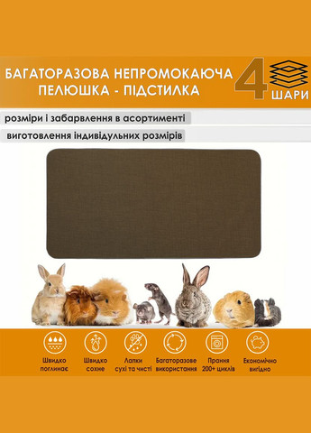 Многоразовая пеленка-подстилка 4 слоя для мелких животных Идеальное решение для комфорта и гигиены ваших питомцев! Подходят для животных: • Собаки • Морские свинки • Крысы • Хорьки • Декоративные кролики • Ежики • Белки дегу • Шиншиллы Наша многоразовая пеленка-подстилка обеспечивает отличную поглощающую способность, мягкость и защиту от протечек, создавая уютную и чистую среду для ваших любимцев. Благодаря своей многослойной структуре, эта подстилка значительно превосходит одноразовые аналоги, обеспечивая экономичность и экологичность. Основные преимущества: * 4 слоя высокоэффективной защиты: * Верхний слой: Мягкий хлопок. Гипоаллергенный и приятный на ощупь. * Первый поглощающий слой: Высокоабсорбирующая ткань, которая мгновенно впитывает жидкость, предотвращая ее растекание. * Второй поглощающий слой: Дополнительный слой для максимального поглощения и удержания влаги. * Нижний водонепроницаемый слой: Прочная и непромокаемая мембрана, которая надежно защищает пол клетки от протеканий и загрязнений. * Экономичность и экологичность: Забудьте о постоянной потребности в одноразовых пеленках, древесных опилках! Наша многоразовая подстилка выдерживает многочисленные стирки, экономя ваши средства и уменьшая количество отходов. * Здоровье и комфорт животного: Сухая поверхность предотвращает раздражение кожи и развитие бактерий, поддерживая гигиену вашего любимца. Мягкий верхний хлопковый слой создает уютное место для отдыха. * Универсальность использования: Идеально подходит для использования в клетках, переносках, манежах, вольерах, а также в качестве подстилки под миски с пищей и водой. * Легкость в уходе: Пеленку легко стирать в стиральной машине при низких температурах. Быстро высыхает. * Разнообразие размеров и цветов: Выберите оптимальный размер, который идеально подойдет для клетки вашего животного, а также цвет, который гармонично впишется в интерьер. Если Вы не нашли нужного размера, можете заказать изготовление подстилки по Вашим размерам Рекомендации по использованию и уходу: * Регулярно проверяйте состояние пеленки и при необходимости заменяйте ее на чистую. * Стирка рекомендуется при температуре не выше 30°C. * Не используйте отбеливатели и агрессивные моющие средства. * Отжим до 700 оборотов * Сушить при низкой температуре или на воздухе. * Не гладить. Выдерживает более 200 циклов стирки Позаботьтесь о чистоте и комфорте вашего маленького друга с нашей надежной многоразовой пеленкой-подстилкой!
