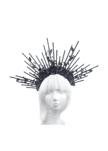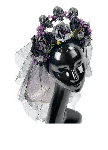 Оригинальный светящийся обруч, декорированный чёрным черепом, цветами сакуры, летучей мышью и двухцветной фатой. В сердцевине каждого цветочка находятся маленькие лампочки, которые при нажатии на кнопку регулировки освещения, в форме маленького розового сердечка, загораются разноцветными огоньками. Этот головной убор - отличное дополнение для карнавальных образов королева монстров, королева тьмы, королева загробного мира, на тематическую вечеринку Хэллоуин (Halloween). Высота композиции - 19,5 см. Длина фаты - 100 см.