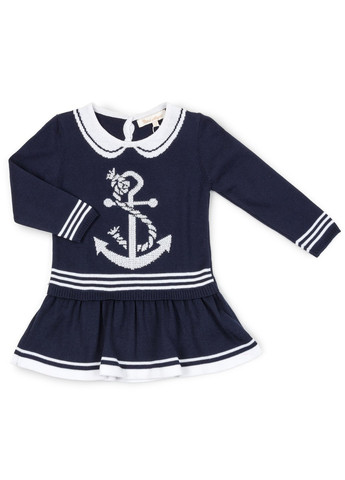 Повседневное, стильное и очень милое платье из тонкого вязаного трикотажа, выполнено в классическом сочетании тёмно-синего и белого цветов, украшенное эффектным, объёмным якорем сверкающим серебристыми стразами.