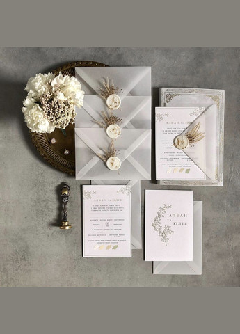 • Нежный полупрозрачный конвертик из пергаментной бумаги ✉️ • 2 Карточки: 1 карточка с текстом приглашения с золотой поталью, 2 карточка "дресс код" на дизайнерской бумаге 📄 • Золотая печаточка с оттиском «Веночек» • Веточка фисташки 🌿 • подберем индивидуально! Стоимость зависит от выбранного дизайна!