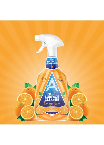 Универсальный очиститель для кухни и различных твердых поверхностей Astonish orange multi-surface cleaner с маслом апельсина 750мл - чистящий спрей надежно удаляет стойкие затвердевшие остатки, нагар и жировые загрязнения. Назначение: средство для очистки духовок, гриля, противней, кастрюль и сковородок Отличное средство для очистки духовок, гриля, противней, кастрюль и сковородок. Мощная активная формула удаляет трудно выводимые жир и запеченную грязь, придает идеальную чистоту и блеск. Спрей можно использовать также на вертикальных поверхностях. Проникает до самых нижних слоев даже самых толстых затвердевших загрязнений, которые при этом не влияют на материал. Спрей для духовок также подходит для грильных сеток, сковородок и каминных экранов. Имеет нейтральный запах и совместим с пищевыми продуктами. Продукция Astonish не тестируется на животных, не имеет в своих составах ингредиентов животного происхождения, подходит для использования веганами, что подтверждено международными сертификатами CFI и Vegan Society. Компания сертифицирована по стандартам ISO 9001, ISO 14001, BRC Consumer Products. Особенности: Универсальное средство с натуральным апельсиновым маслом для удаления грязи и жира на твердых поверхностях по всему дому. Идеально подходит для повседневной очистки кухонных поверхностей, окрашенных глянцевых поверхностей, ПВХ поверхностей, керамической плитки и эмалированных поверхностей Делает поверхность блестяще чистой