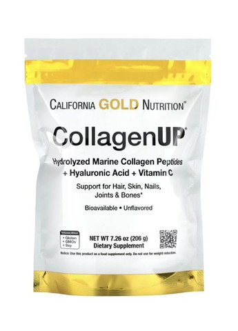 Коллаген морской California Gold Nutrition, CollagenUP гидролизованные пептиды с гиалуроновой кислотой и витамином C 206 г Диетическая добавка. Не является лекарственным средством. Описание - CollagenUP (206 г / 7,26 унции) от California Gold Nutrition - Пептиды морского коллагена, гиалуроновая кислота и витамин C - Содержит гидролизованный рыбий (не бычий) коллаген без вкусовых добавок - Содержит гиалуроновую кислоту и витамин C неживотного происхождения - Поддержка здоровья волос, кожи, ногтей, суставов и костей* - Гидролизованный ферментативным способом коллаген, расщепленный на биодоступные пептиды - Не содержит глютена, ГМО и сои - Производится на предприятии, которое имеет регистрацию текущей надлежащей производственной практики (cGMP) и проходит независимые проверки - Гарантия 100% Gold Guarantee - Теперь в пакете многоразового использования для удобного хранения Коллаген, гиалуроновая кислота и витамин C способствуют здоровью и нормальному функционированию опорно-двигательного аппарата. CollagenUP от California Gold Nutrition содержит все три ингредиента для поддержания здоровья волос, кожи, ногтей, суставов и костей*. Порошок с нейтральным вкусом можно быстро смешивать с любимым напитком, что делает его удобным способом добавить коллаген в свой рацион. Типы коллагена Коллаген — основной структурный белок, который содержится в тканях и органах тела и обеспечивает ключевые процессы жизнедеятельности внутри и снаружи организма. Существует множество типов коллагена, которые различаются по молекулярной структуре и способу использования в организме. Наш порошок CollagenUP содержит коллаген типов I и III, которые являются двумя из пяти основных типов коллагена. - Тип I. Этот тип коллагена составляет от 80 до 90% всего коллагена в организме. Коллаген типа I имеет плотную структуру и укрепляет кожу, кости, сухожилия и связки. - Тип II. Этот тип коллагена, содержащийся в эластичных хрящах, таких как хрящи коленей и плеч, обеспечивает поддержку суставов. - Тип III. Этот тип коллагена обычно присутствует в организме вместе с типом I и содержится в мышцах, артериях и органах. - Тип IV. Коллаген типа IV содержится в слоях кожи и помогает поддерживать различные функции кожи. - Тип V. Этот тип коллагена содержится в роговице глаз, костях, некоторых слоях кожи, волосах и тканях плаценты. - Пищевая ценность Размер порции: 1 мерная ложка (5,16 г♦) Порций в упаковке: прибл. 39 Количество в 1 порции: % от суточной нормы Калории 20 Белки 4 г < 1%** Витамин C (в виде аскорбата кальция) 90 мг 100% Натрий 20 мг < 1% Гидролизованные пептиды морского коллагена 5 г † Гиалуроновая кислота (в виде гиалуроната натрия) 60 мг † Гиалуроновая кислота и витамин C в составе Наша усовершенствованная формула также содержит два дополнительных ингредиента для выработки энергии — гиалуроновую кислоту и витамин C. Гиалуроновая кислота — компонент соединительной ткани, обеспечивающий жидкую матрицу для смазывания суставов, увлажнения и восстановления кожи. Исследования показывают, что регулярное потребление этих питательных веществ обеспечивает снабжение организма основными строительными материалами, которые способствуют поддержанию здоровья суставов, костей, кожи, волос и ногтей*. CollagenUP от California Gold Nutrition содержит пептиды морского коллагена (не бычьего происхождения), а также гиалуроновую кислоту и витамин C. Прошедший специальную обработку рыбий коллаге