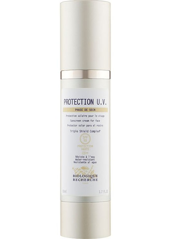 Принимать солнечные ванны – любимое занятие во время отпуска. Слушать шум волн и нежиться в лучах солнца и не забывать вовремя наносить Средство по уходу за кожей во время загара - Biologique Recherche Protection U.V. SPF 50. Уникальная формула бьюти-продукта создана для того, чтобы защитить кожный покров от пигментации, фотостарения, сухости и ожогов. В ее основе находится специальный Triple Shield Complex ©, полностью состоящий из натуральных физических фильтров и не содержащий наночастиц. Особенности Biologique Recherche Protection U.V. SPF 50: - содержит Triple Shield Complex ©: 100% натуральные физические фильтры без наночастиц; - высокий фактор защиты: SPF 50; - защищает кожу от UVA и UVB, а также инфракрасного излучения; - интенсивно и глубоко увлажняет; - устраняет сухость и стянутость; пятен;- успокаивает эпидермис;- снимает покраснение, раздражение, чувство дискомфорта;- дарит коже бархатность и гладкость;- комфортно наносится и быстро абсорбируется;- сохраняет кожу упругой, гладкой и шелковистой.