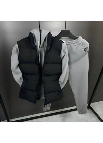 Спортивный костюм 3-ка изготовлен из тринитки на флисе которая имеет гладкую фактуру и из плотной плащевки. Тринитка имеет минимальную эластичность, учитывайте это при подборе размера. Благодаря своему фасону - костюм хорошо садится по фигуре. Жилетка удлиненного кроя с капюшоном, имеет силиконовый наполнитель и подкладку. Также жилетка имеет врезные карманы по бокам и один карман внутри. Худи оверсайз фасона с длинными рукавами на манжетах, плечевой шов спущен, что создает свободный силуэт. Худи с капюшоном и карманом-кенгуру. Штаны-джогери на манжетах, со средней посадкой и широкой резинкой на талии без застежек. По бокам присутствуют кинены с отрезным бочком.