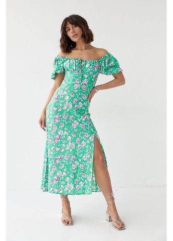 Изысканный глубокий вырез на плечах создает элегантный и одновременно чувственный образ, открывая ключицы и добавляя изящества. Длинные рукава балансируют откровенность верхней части платья, сохраняя гармоничность силуэта.
