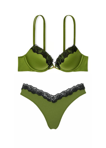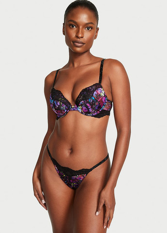 Женский комплект белья Victoria´s Secret. Стильный комплект из гладкого материала в комбинации с кружевом. Модель с Push-Up №1 с классическим подъемом и формой, которые вам нравятся, получила обновленную версию с ярким принтом в виде бабочек и цветов, отделанным черным кружевом, и мерцающими блестящими бретелями со стразами. Подкладка Push-Up добавляет чашку на 1 размер. Средний подъем. На косточках. Полностью регулируемые бретели, украшенные черными стразами. Застежка на крючки сзади. Сзади комбинация сетчатого и кружевного материала. Гладкие трусики, украшенные кружевом сверху. Эти едва заметные кружевные трусики дополнены новыми блестящими ремешками, украшенными мерцающими черными стразами. Низкая посадка. Ножка с высоким вырезом. Хлопковая вставка с ластовицей. Отличное качество.