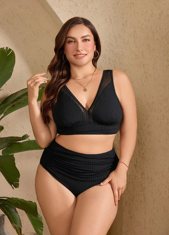 Женский купальник-бикини SHEIN Swim Curve Plus Size. Этот чёрный купальник с глубоким вырезом и высокой талией состоит из верха и плавок на подкладке. Комплект изготовлен из 95% полиэстера и 5% эластана. Высокая эластичность. Можно стирать в стиральной машине или чистить в химчистке.