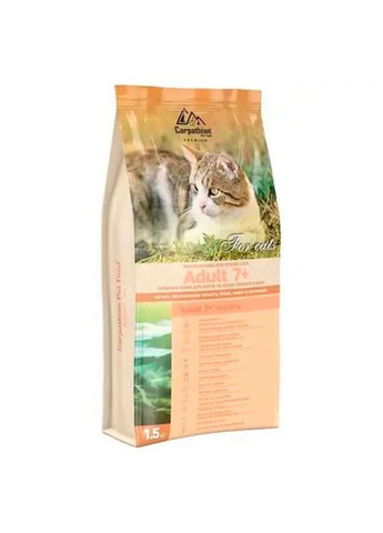 Растительная клетчатка улучшает работу кишечника, пищеварение, обеспечивая профилактику запоров. Цинк оздоравливает кожу и шерсть, придает им эластичность и здоровый блеск. Регулярное употребление сухого корма для кошек от Carpathian Pet Food «Adult 7+», который можно заказать он-лайн, усиливает обмен белков, повышает мышечный тонус. Пониженное содержание натрия и фосфора уменьшает нагрузку на сердце и почки. Особенности и преимущества : для кошек и котов пожилого возраста (старше 7 лет); с уменьшенным количеством белков и жиров; предотвращает развитие ожирения; облегчает работу почек; L-карнитин обеспечивает процесс расщепления жиров, усиливает обмен белков, повышает мышечный тонус, способствует снижению лишнего веса, поддерживает работу сердца; повышенное содержание витаминов: А, Е, группы В; увеличено количество клетчатки улучшает работу кишечника, пищеварение, профилактика запоров; цинк улучшает состояние кожных и шерстяных покровов; сниженное количество натрия и фосфора уменьшает нагрузку на сердце и почки. Состав : мука из курицы (25%), пшеница, кукуруза, бурый нешлифованный рис, куриный жир, мука сардины (5%), протеин гидролизованный животный, кукурузный глютен, мякоть сахарной свеклы (1,82%), пивные дрожжи, лососевое масло (0,5%), сушеная морковь, сушеные томаты, пищевая целлюлоза (0,18%), сушеные яблоки, сушеный корень сельдерея, Bio-Mos® (0,2%, источник маннанолигосахаридов), подорожник, сушеная черника, сушеная клюква, пребиотик Actigen®, цветы ромашки, экстракт юкки Шидигера (0,02%), глюкозамин сульфат, хондроитин сульфат. Добавки : Питательные добавки (на 1 кг корма): витамин А – 18 000 МЕ; витамин D₃ – 1000 МЕ; витамин Е – 620 мг; витамин С – 300 мг; витамин К₃ – 1,4 мг; витамин B1 – 6,11 мг; витамин B2 – 4,21 мг; кальций D-пантотенат – 6,52 мг; ниацин – 40,12 мг; витамин B6 – 4,17 мг; фолиевая кислота – 1,26 мг; витамин B12 – 0,16 мг; биотин – 0,105 мг; холин хлорид – 3,56 г; железа сульфат – 14,2 мг; калий йодид – 2,6 мг; сульфат меди – 4,8 мг; марганца сульфат – 22,7 мг; цинка оксид – 118,5 мг; селенит натрия – 0,05 мг; DL-метионин – 1500 мг; таурин – 2200 мг, L-карнитин – 100 мг. Технологические добавки: экстракты токоферола из растительных масел (1b306(i)). Аналитические составляющие корма : сырой протеин – 32%, сырые жиры – 14%, сырая зола – 6%, сырая клетчатка – 2%, кальций – 0,93%, фосфор – 0,85%, Омега-3 жирные кислоты – 0,5%, Омега-6 жирные кислоты – 2,3%. Энергетическая ценность (калорийность) 100 г: 390 ккал (по NRC 2006). Рекомендованные нормы кормления : Вес кота/кошки Количество корма в сутки 2 кг 41 г 3 кг 62 г 4 кг 83 г 5 кг 104 г 6 кг 124 г 7 кг 145 г Рекомендации по кормлению : вводите новый корм постепенно, в течение первых 5 дней с увеличением суточной дозы до рекомендуемого количества. Животное должно иметь постоянный доступ к свежей питьевой воде. Фасовки : 1,5 кг; 12 кг