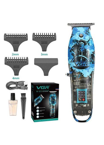 Триммер VGR V-923 несомненно понравится всем поклонникам функциональных инструментов для барберов и домашнего использования с современными возможностями и эргономичным дизайном. Модель очень интересна, компактна и имеет привлекательный дизайн, не похож на другие. Машинка оснащена Т-образным ножевым блоком шириной 40 мм из качественной нержавеющей стали с минимальным срезом волос 0,1 мм. При такой ширине можно значительно быстрее выполнять окантовку и стрижку, а также легко работать в сложных зонах, например висках, или с усами, при стрижке бороды. Лезвия триммера более острые и износостойкие, по сравнению с моделями других брендов, в комплекте поставляются три насадки (2 мм, 3 мм и 4 мм). Мотор триммера выполнен с использованием технологии цифрового управления, благодаря чему отличается длительным сроком службы и исключительными результатами работы. Данная модель справится абсолютно с любой задачей, будь то профессиональное применение или домашнее. Мотор имеет микропроцессорный контроль оборотов и мощности – специальный чип контролирует работу и поддерживает постоянную мощность, независимо от уровня заряда аккумулятора. Триммер работает от литиевого аккумулятора емкостью 1400 мА*ч, что позволяет достичь до 2,5 часов полностью автономной работы, а полная зарядка занимает все те же 2,5 часа. Аккумулятор можно заряжать в любое время, независимо от остаточного уровня заряда. На корпусе изделия имеется светодиодный LED-индикатор, отображающий состояние заряда аккумулятора в процентах, а также сообщает о необходимости смазки ножей. Триммер можно подключать к адаптеру питания и использовать как проводную машинку, одновременно заряжая батарею. Особенности машинки: Современная беспроводная модель Низкий уровень шума Тип питания: аккумулятор/сеть (комбинированная) Тип аккумулятора: Li-ion без эффекта химической памяти Время работы: 2,5 часа Время зарядки: 2,5 часа Тип ножевого блока: Т-образный ножевой блок Материал ножей: Нержавеющая0 среза: 0,1 мм Мощность: 5V Емкость аккумулятора: 1400 мА*ч Скорость мотора: 5000 об/мин LED-индикатор состояния аккумулятора и смазки ножей Эргономичная и сбалансированная Вес: 500 граммов мм 3 мм 3 Смазка Щеточка для очистки ножей от волос Сетевой шнур USB с зарядным блоком Сопровождающая документация
