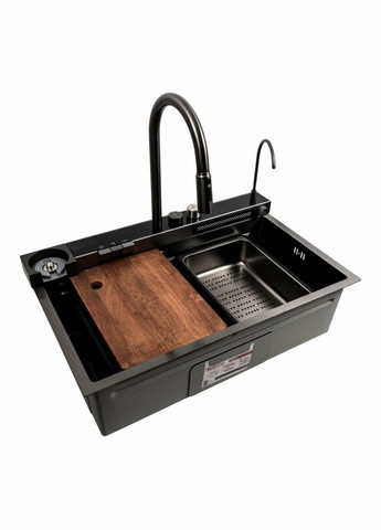 Кухонная мойка 75*46D PVD черная Platinum Handmade "ВОДОСПАД" - невероятно популярная кухонная мойка, настоящее открытие! Ее функциональность и комплектация со смесителем делают ее незаменимым аксессуаром для любой кухни. Размер мойки 750х460х205 мм. Размер чаши 700×361×205 мм. Мы представляем вам кухонную мойку Platinum, изготовленную из высококачественной нержавеющей стали марки SS 201. Эта мойка относится к премиум-сегменту и предназначена для эксклюзивных кухонь. Смеситель выдвижной с душем, а также имеет удобный режим водопада, который можно менять, что позволяет комфортно мыть фрукты, овощи и зелень. Кроме того, этот набор позволяет сэкономить кухонное пространство благодаря VIP комплекту, включающему: -разделочную доску из влагостойкой породы дерева, -лоток для размораживания продуктов -лоток для мытья овощей, фруктов и зелени. -Кран для питьевой воды -Ополаскиватель для стаканов -сифон -Смеситель Инновационный и модернизированный дизайн раковины придаст вашей кухне новое чувство. Она прекрасно переносит перепады температуры и защищает от коррозии. Мойка изготовлена из корпуса толщиной 3 мм и боковых стенок чаши толщиной 1 мм, что обеспечивает высокую прочность и долговечность. Кроме того, эта мойка полностью обешумена, что позволяет вам наслаждаться тишиной и спокойствием во время ее использования.