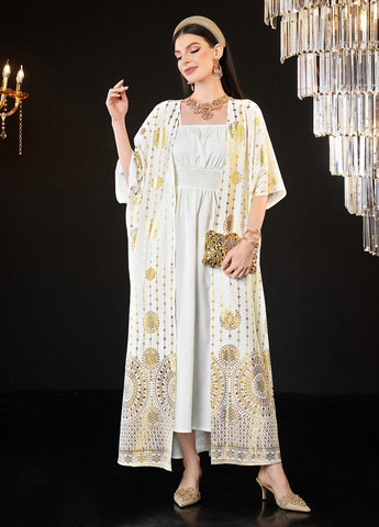 Этот комплект SHEIN Najma состоит из платья на тонких бретельках и накидки с золотым фольговым принтом. Свободный крой подчеркивается сборчатым дизайном. Накидка имеет рукава «летучая мышь» и спущенные плечи. Ткань не тянется.