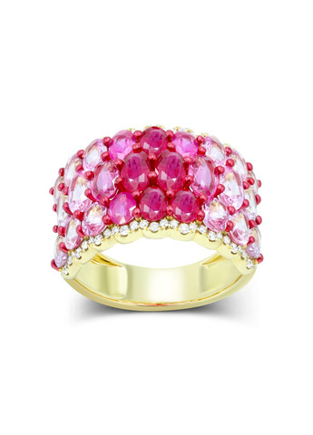 Феерия цвета, блеск драгоценных камней очаровывает с первого взгляда. Кольцо изготовлено из белого золота 585-й пробы, для дополнительной защиты от механических повреждений покрыто тонким слоем родия. Ветчина состоит из трех оснований, переплетенных между собой. Каждое из трех основ кольца щедро декорировано драгоценными рубинами и королевскими розовыми сапфирами круглой и овальной огранки. Дизайн украшения дополняют дорожки из прозрачных бриллиантов круглой огранки.