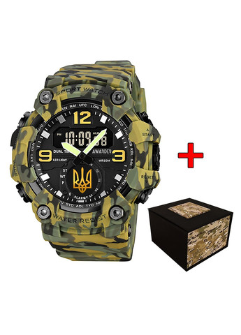 Представляем вам наручные часы Awarder 003BKUAGD с элегантным дизайном и стильным трезубцем на корпусе, подчеркивающим украинское происхождение. Эти спортивные и армейские часы выполнены из надежного полимерного материала, обеспечивающего легкость (вес 70 г) и водонепроницаемость до 50 м, что делает их идеальным спутником для активного образа жизни. Часы имеют круглую форму корпуса диаметром 54 мм и полимерное стекло. Удобный каучуковый ремешок длиной 26,5 мм обеспечивает комфортное ношение. Стрелочно-электронный циферблат с индикацией часов, минут, секунд, дня недели и числа, а также подсветкой, делают часы не только стильными, но и функциональными. Часы оснащены кварцевым механизмом и имеют множество полезных функций: будильник, календарь, секундомер, второй часовой пояс. Производимые в Украине, эти часы станут отличным выбором для современного мужчины, который ценит стиль и качество. Купите часы Awarder 003BKUAGD уже сегодня и получите стильную коробку в комплекте!