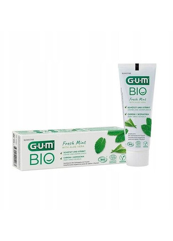 Зубная паста «Свежая мята» от бренда G.U.M – это органический и натуральный продукт для поддержания гигиены полости рта. Активная формула средства на 99% состоит из природных веганских компонентов. Фтор и фторид добавлены для укрепления зубов и десен, защиты от кариеса и других болезней полости рта. Экстракт перечной мяты обеспечивает приятный освежающий эффект. Алоэ вера в сложные оказывает успокаивающее, противовоспалительное и антибактериальное эффекты. Паста гарантирует мягкий уход за полостью рта Особенности G.U.M Bio Fresh Mint Toothpaste: - является на 100% веганским продуктом; - фтор укрепляет и защищает зубы от кариеса, способствует реминерализации эмали, укрепляет десна; - фторид предотвращает появление формул агрессивных ингредиентов, глютена и лактозы; – упакована в картонную коробку, которая на 100% пригодна для вторичной переработки; – сертифицирован COSMOS ORGANIC Ecocert Greenlife & Cosmebio.