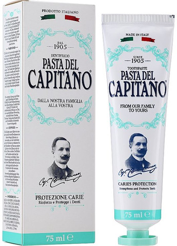 Зубная паста «Защита от кариеса» от бренда Pasta Del Capitano – это эффективное решение для обеспечения надлежащей гигиены полости рта и сохранения здоровья зубов. Она обогащена эксклюзивной молекулой Sulfetal Zn, которая эффективно нейтрализует патогенные микроорганизмы и предотвращает развитие различных стоматологических заболеваний. Также в состав средства входит 2 вида солей фтора. Они способствуют эффективному укреплению и реминерализации эмали. Особенности зубной пасты Caries Protection от бренда Pasta Del Capitano: - инновационная формула с молекулой Sulfetal Zn, 2 видами солей фтора и органической мяты; - эффективно устраняет микрочастицы пищи и налет; - нейтрализует патогенные бактерии; мягкие ткани полости рта; - освежает дыхание; - имеет приятный мятный аромат.