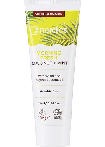 Зубная паста «Утренняя свежесть» от бренда Nordics деликатно устраняет микрочастицы пищи, желтый налет и патогенные микроорганизмы. Благодаря наличию в составе ксилитола она поддерживает оптимальный уровень рН полости рта, предотвращает развитие кариеса и образование зубного камня. Также средство обогащено органическим маслом кокоса, поэтому оно положительно влияет на десны и мягкие ткани. Особенности Morning Fresh Tooshpaste от бренда Nordics: - деликатная формула без фтора; - обогащенная ксилитолом и органическим кокосовым маслом; - оказывает деликатное очищающее действие; - проявляет высокую противомикробную активность; - способствует укреплению и реминерализации эмали; профилактикой появления кариеса, зубного камня и ряда других стоматологических заболеваний; - имеет приятный кокосово-мятный вкус; - отмечена сертификатом EcoCert; - vegan-friendly.