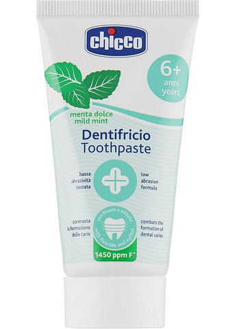 Фторид принимает участие в реминерализации зубной поверхности и замедляет процесс деминерализации эмали. Это означает, что профилактика фтором необходима для предотвращения кариеса у детей. Выполнять ее можно одновременно с чисткой зубов, используя зубную пасту «Нежная мята» с фтором от бренда Chicco. Этот продукт идеально подходит для ежедневного ухода за зубами и полостью рта детей от 6 лет. Особенности зубной пасты «Нежная мята» с фтором от бренда Chicco: - одобрена Ассоциацией стоматологов Италии; - содержание фтора 1450 ppm* и ксилитола позволяет защитить зубную эмаль от появления кариеса и предотвратить заболевания зубов и десен; - формула не содержит парабен и парабен; Е, защищающие десны от патогенных микроорганизмов; кальций усиливает противокариозный эффект; сбалансированный pH нейтрализует вредное влияние сахара; имеет низкую абразивность, благодаря чему бережно очищает зубы, не повреждая эмаль; упаковка изготовлена из 100% переработанной бумаги (F).