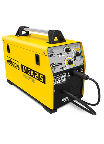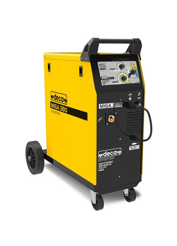 Сварочный инверторный полуавтомат DECA MIG/MMA/TIG MIGA 380 предназначен для тех, кому нужно выполнять сварочные работы на строительстве своего дома, в гараже или небольшой мастерской. Этот сварочный полуавтомат наилучший в соотношении цены и качества. Устройство имеет инновационный интерфейс EASY MIG FULL SETTING, который позволяет вести сварку в следующих режимах: Synergic MIG /S Manual MIG / WIRE No Gas / MMA / TIG Lift. Синергетический режим MIG позволяет производить прочные соединения деталей из стали, нержавеющей стали, алюминия. Для режима MMA доступно сваривание электродами с основным и рутиловым покрытием. Сварочный полуавтомат собран по схеме инвертора, имеет малый вес (30 кг.) и габариты 775 х 400 х 700 мм. Подключается к однофазной сети переменного тока напряжением 230 В. и потребляет мощность 5 кВт. Может выдать 200 А. постоянного тока. Однако в оптимальном режиме при ПВ = 60 % работает с током 100 А. на всех видах сваривания. Напряжение холостого хода 86 В. гарантирует уверенный поджиг дуги. Уже привычный для наших потребителей режим Synergic MIG обеспечивает простую настройку системы. Для уменьшения сварочных брызг предусмотрена регулировка индуктивности в режиме MIG. Получить оптимальный режим сварки независимо от особенностей электродов можно при использовании режима с регулируемой силой дуги. Для точных работ идеальные условия можно создать в режиме TIG Lift. В этом режиме можно регулировать крутизну сварочной характеристики, добиваясь плавного уменьшения величины сварочного тока в конце шва и плавного увеличения сварочного тока в начале шва, что позволяет делать швы безупречного качества. Сварочный аппарат защищен от перегрева термостатической защитой, имеет двухроликовый механизм подачи проволоки. Поставляется с горелкой MIG 180A, кабелем с зажимом заземления и газовым шлангом.