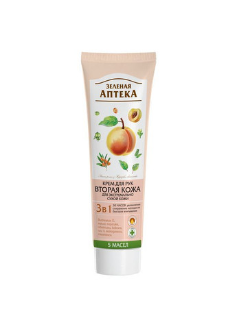 Крем для рук Зеленая Аптека Вторая кожа 3 в 1 - интенсивный уход для экстремально сухой и обезвоженной кожи рук, обеспечивающий увлажнение, питание и защиту. Основные преимущества: интенсивно увлажняет и поддерживает водный баланс кожи формула 3 в 1: ультразащита, питание, быстрое впитывание содержит комплекс из 5 масел (ши, кокос, персиковые косточки, облепиха, макадамия) для быстрого восстановления и защиты кожи ухаживает за ногтями быстро впитывается, не оставляет липкости смягчает, тонизирует и дарит ощущение ухоженности и комфорта Способ применения: наносите крем на сухую чистую кожу рук, втирая до полного впитывания. Характеристики Объем: 100 мл Производитель: Зелена Аптека, Украина.