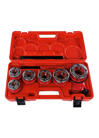 Набор клепов с трещоткой 6шт. 1/4", 3/8", 1/2", 3/4", 1", 1.1/4" Haisser Назначение – для нарезки наружной резьбы на стальных трубах. Позволяют выполнять точные резьбовые соединения при проведении ремонтных, строительных и гидравлических работ. Все клупы имеют одинаковое крепление. Простой способ установки головки в ручку и плавно движущийся храповик обеспечивают быстрое переключение направления резьбы. Характеристики: Направление резьбы права; Корпус из кованого чугуна; Резцы клепов из высококачественной закаленной быстрорежущей стали 9CR2; Двухсторонняя трещотка с ручкой; Длинная ручка с покрытием из противоскользящего пластика для комфортной работы; Набор упакован в пластиковый кейс.