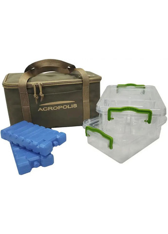 Термосумка Acropolis ТСН допоможе зберегти наживку, яка використовується в фідерній і поплавочній риболовлі (черв'як, опариш і мотиль), в періоди підвищеної температури повітря. Завдяки спеціальній конструкції з поліестеру, пінополіетилену і фольги, всередині зберігається постійна температура, а застосування акумулятора холоду сприяє збільшенню часу зберігання наживки в свіжому стані. Залежно від моделі, сумка може комплектуватися двома великими або чотирма маленькими коробками з вентиляційними отворами і акумулятором холоду, який кріпиться всередині на кришці. Переносити сумку можна за ручку, розташовану у верхній частині. Термосумка Acropolis ТСН-2 для тривалого зберігання живих наживок (черв'як, опариш і т.д.), укомплектована акумулятором холоду і двома коробками 13,5х13,5х5см.