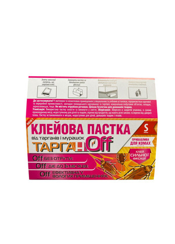 Увага! Вартість товару не включає вартість доставки! Оформляючи замовлення, Ви погоджуєтесь з умовами оплати і доставки. Додаткова інформація - у розділах: та ! ТарганОфф S (125×100) – Клейова пастка від тарганів і мурашок (до 3 місяців), АгроПротекшн Опис продукту: ТарганОфф S – ефективна клейова пастка для боротьби з тарганами та мурахами у житлових і нежитлових приміщеннях. Завдяки спеціальній формулі клею, пастка забезпечує тривалу дію (до 3 місяців) і не містить токсичних речовин, що робить її безпечною для людей і домашніх тварин. Переваги: ✅ Безпечна – не містить хімічних інсектицидів, не має запаху. ✅ Екологічно чиста – підходить для використання у житлових приміщеннях, закладах харчування, дитячих кімнатах. ✅ Тривалий ефект – активна до 90 днів. ✅ Проста у використанні – достатньо розмістити у місцях скупчення комах. ✅ Потужна феромонна приманка – швидко приваблює шкідників. Застосування: Зняти захисну плівку з клейової поверхні. Скласти пастку у форму будиночка або залишити у розгорнутому вигляді. Розмістити у місцях скупчення тарганів або мурах (біля плінтусів, за меблями, у шафах, під раковиною). Замінити пастку після заповнення або кожні 3 місяці. Розмір: 125×100 мм Час дії: до 3 місяців Виробник: АгроПротекшн ТарганОфф S – ефективне рішення для швидкого позбавлення від комах без використання токсичних речовин! 🚫🐜
