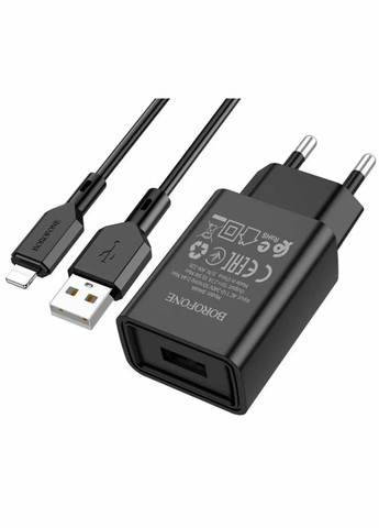 Мережевий зарядний пристрій Borofone BA68A допоможе безпечно зарядити сучасні портативні ґаджети. Модель являє собою набір з адаптера, обладнаного роз'ємом USB і відповідного надійного кабелю USB — Lightning, використання якого забезпечить його повноцінну роботу. Аксесуар реалізований у класичному, практичному дизайні, має невеликі розміри та вагу, виготовлений із заокругленими бічними ребрами та злегка піднятими бортиками верхнього торця, у якому розміщений вихідний роз'єм. Його корпус якісно зібраний, виготовлений із приємного на дотик, міцного, стійкого до ударів, подряпин і високих температур полікарбонату. Адаптер може під'єднуватися до мереж із напругою від 110 до 240 В, для чого є вилка стандарту EU, яка розташована на його нижньому торці. Максимальна сила струму на виході USB порту становить 2.1 А, потужність — 10.5 Вт. Модель обладнана багаторівневою системою захисту та функцією Smart ID для автоматичного визначення необхідної сили струму, що заряджається ґаджету.