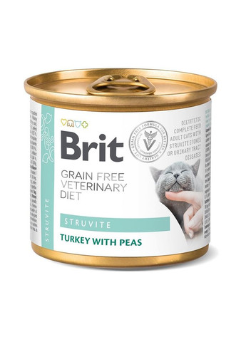 Повнораціонний та збалансований дієтичний корм у вигляді паштету для котів, які страждають захворюваннями нижніх сечовивідних шляхів. Показання: нутритивна підтримка під час лікування запалення нижніх сечовивідних шляхів розчиняє та запобігає утворенню струвітних каменів і кристалів знижує ризик утворення струвітних і оксалатних каменів нутритивна підтримка під час лікуванні котів із ідіопатичним циститом Протипоказання: не використовуйте з засобами, які підкислюють сечу хронічна ниркова недостатність захворювання серцево-судинної системи Переваги: Обмежує надмірне насичення сечі речовинами, які спричинюють утворення каменів Контроль ph сечі, що дає можливість розчиняти струвіти та запобігати утворенню оксалатів Протизапальна дія на сечовидільну систему, стимулює діурез Відсутність ризику виникнення алергії на глютен або глютенової ентеропатії та низький глікемічний індекс для профілактики ожиріння Знижує рівень стресу Спосіб застосування: Розчинення струвітних каменів: Щоб розчинити струвітні камені, давайте коту Brit VD Struvite Cat протягом 5–12 тижнів. Регулярно перевіряйте, чи відповідає рівень pH сечі кота потрібним значенням, а для старіючих котів — потрібній функції нирок. Запобігання утворенню струвітів і оксалатів: Згідно аналізу сечі, щоб запобігти утворенню нових струвітних каменів, давайте коту Brit VD Struvite Cat впродовж 6 місяців. Регулярно перевіряйте, чи відповідає рівень pH сечі кота потрібним значенням. Інструкція з годування: Проконсультуйтеся з ветеринаром з приводу використання дієтичного корму Brit VD — якщо він поєднується з сухим кормом Brit VD Cat Grain Free Struvite, зменште дозу відповідно. Використовуйте протягом 5–12 тижнів для розчинення струвітів, і впродовж 6 місяців для запобігання повторного утворення струвітних каменів. Рекомендується проконсультуватися з ветеринаром перед використанням або перед продовженням періоду використання корму. Переконайтеся, що кіт завжди має доступ до свіжої питної води. Склад: індичка (55%), зелений горох (3%), горохове борошно, масло лосося (2%), лігноцелюлоза, сушені водорості (0,5%, Ascophyllum nodosum), натрій хлорид (0,5%), сульфат кальцію (0,35%), сушене листя брусниці (0,2%, Vaccinium vitis-idaea), мананолігосахариди (0,01%), фруктоолігосахариди (0,01%), Юка Мохаве (0,008%), β-глюкани (0,008%), обліпиха сушена (0,006%). Аналітичні компоненти: сирий протеїн 9,0%, сирий жир 8,0%, сира зола 2,0% вологість 78,0%, сира клітковина 1,0%, кальцій 0,2%, фосфор 0,2%, натрій 0,8%, магній 0,04%, калій 0,3%, хлориди 0,35 %, сірка 0,1 %, гідроксипролін 0,1 %, вітамін D3 200 МО/кг, Омега-3 0,2 %, Омега-6 0,3 % Харчові добавки на 1 кг: вітамін А 6000 МО, вітамін D3 100 мг, вітамін Е 300 мг, біотин 1,5 мг, цинк 50 мг, залізо 30 мг, марганець 30 мг, йодид калію 1,8 мг, мідь 1,5 мг, селен 0,1 мг, L-карнітин (3a910) 100 мг, L-метіонін 5000 мг, L-триптофан 10 мг, L-аргінін 10 мг. Енергетична цінність: 1,140 ккал/кг Вага кота Добова норма 2 кг 250 г 4 кг 250 г 6 кг 350 г 10 кг 450 г