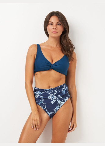 Купальник, що складається з ліфа та трусиків. Ліф з однотонної, рівної тканини зі знімними вкладишами, з вузликом спереду, з регульованими бретелями та із застібкою на гачок на спинці. Трусики з малюнком зі збиранням на животі та високою посадкою. Можливе пошкодження бирки