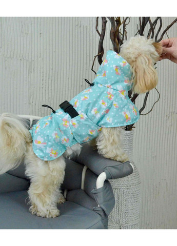 Одяг для домашніх улюбленців: водовідштовхувальна плащівка підкладка з водовідштовхувальної плащової тканини застібається поясом на спинці, регулятор обхвату грудей регулятор обхвату шиї регульована довжина спинки резиночки для фіксації дощовика на задніх лапах високий капюшон-комірець, який закриває вушка (можна підвернути) отвір для повідця модель унісекс;